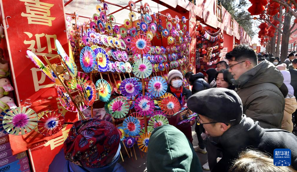 2月3日,市民在地坛春节文化庙会上购买风车。