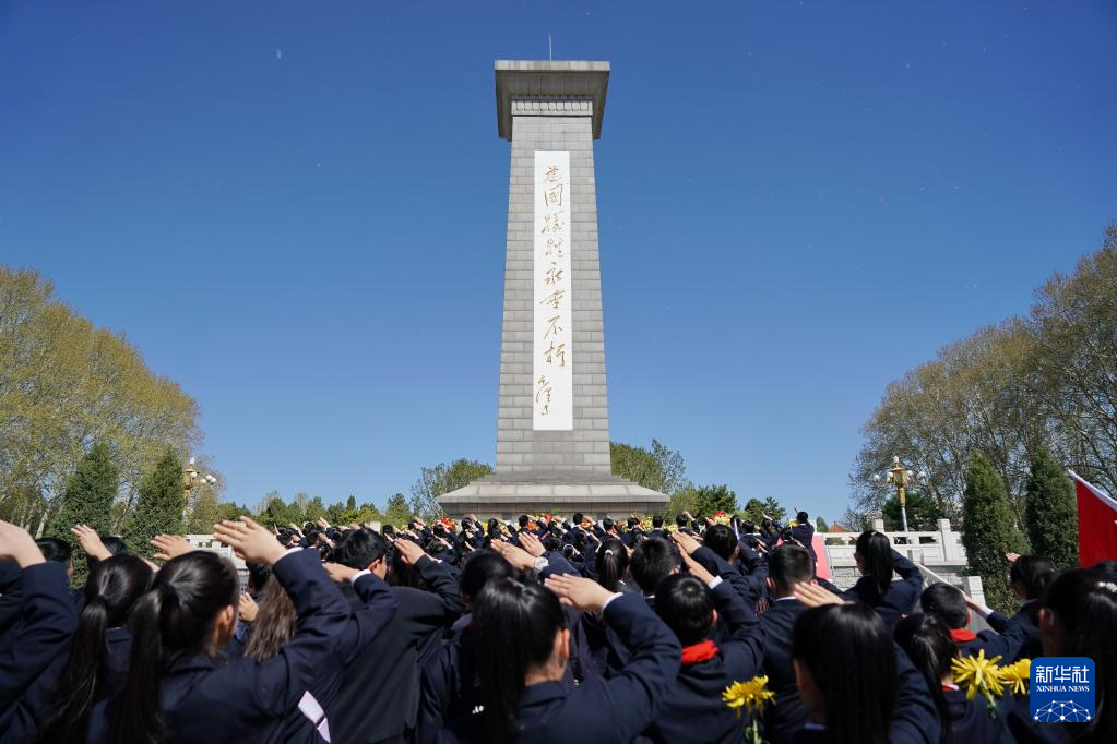 4月1日,在位于石家庄市的华北军区烈士陵园,学生在烈士纪念碑前敬礼。