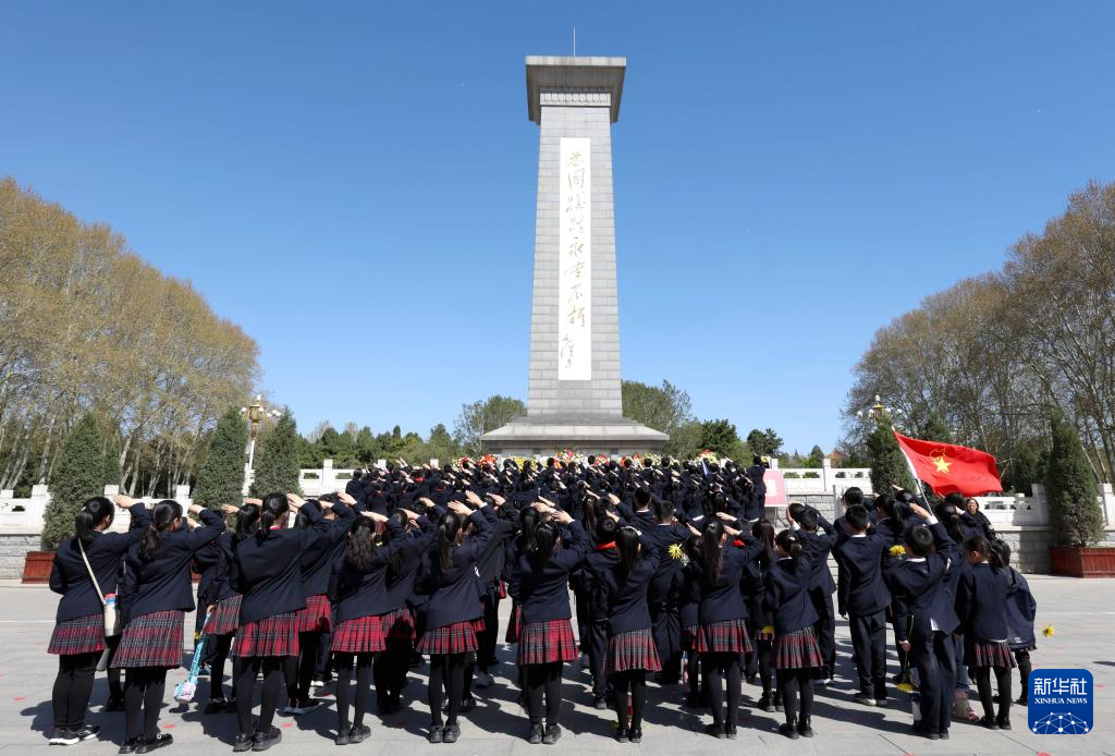 4月1日,在位于石家庄市的华北军区烈士陵园,学生在烈士纪念碑前敬礼。