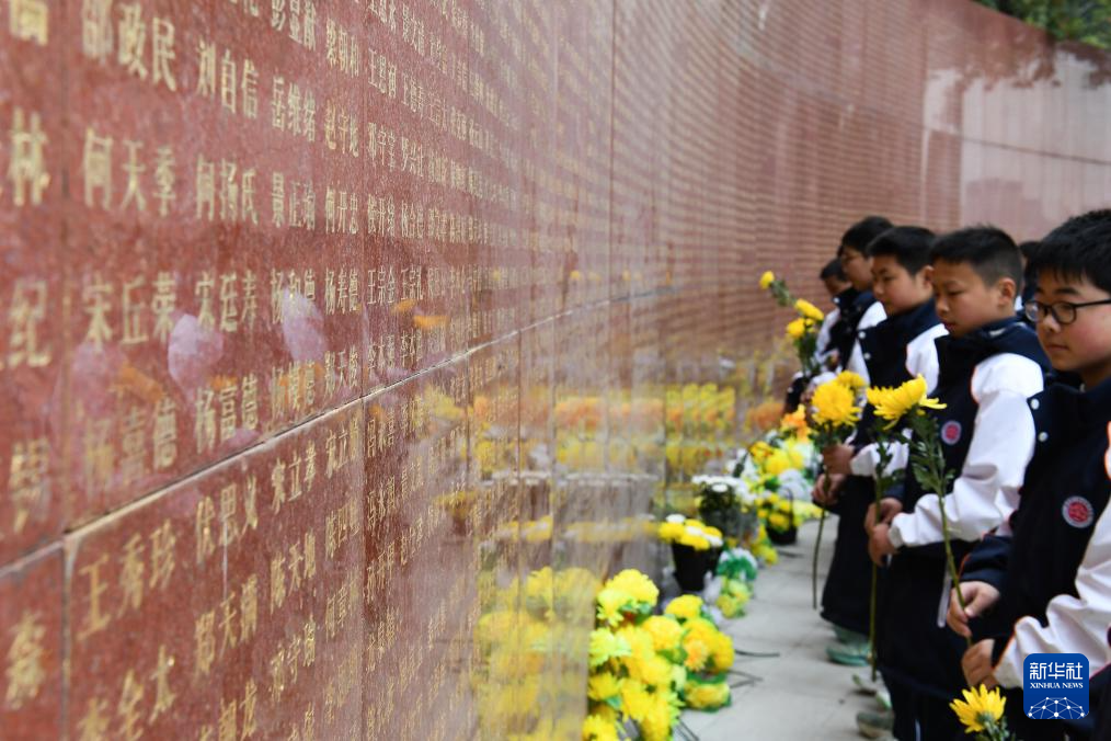 4月1日,在四川省阆中市红军烈士纪念园,学生向英名墙献花。