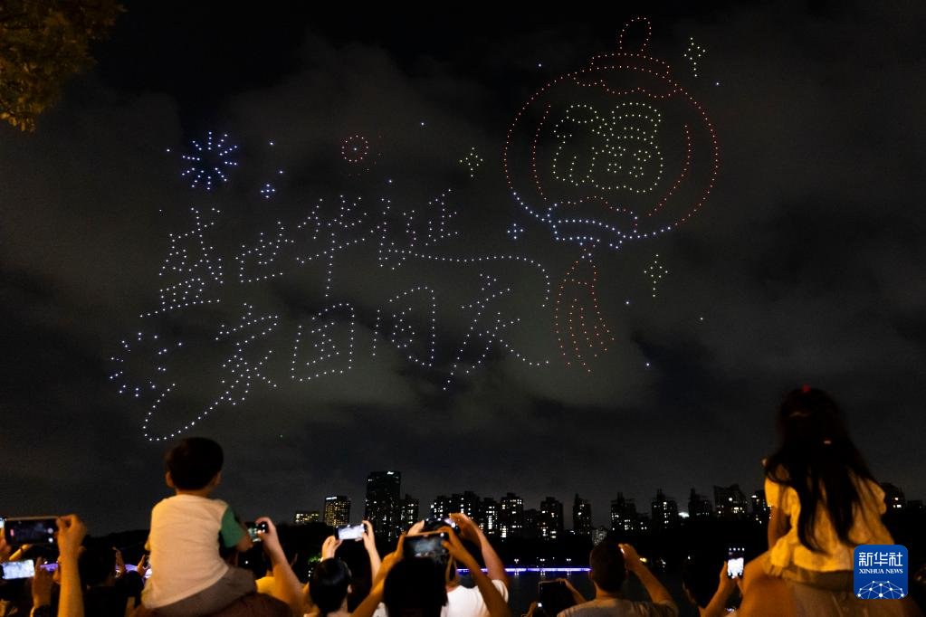 9月27日,市民游客在上海世纪公园观看无人机灯光秀。当晚,“世纪璀璨——无人机灯光秀”表演在上海世纪公园举行,1000架无人机在世纪公园镜天湖上空组成“国庆快乐”“盛世华诞家国同庆”“浦东欢迎您”等字样和玉兰、荷花、梅花等花卉图案,在国庆假期即将到来之际,为市民游客献上一场视觉盛宴。新华社记者王翔摄