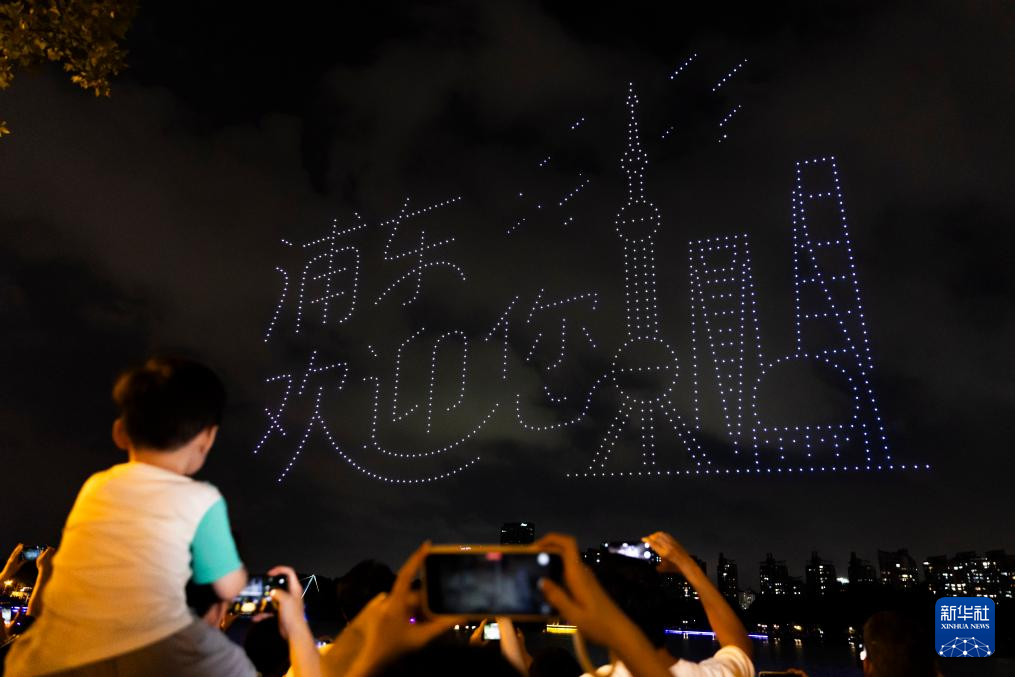9月27日,市民游客在上海世纪公园观看无人机灯光秀。当晚,“世纪璀璨——无人机灯光秀”表演在上海世纪公园举行,1000架无人机在世纪公园镜天湖上空组成“国庆快乐”“盛世华诞家国同庆”“浦东欢迎您”等字样和玉兰、荷花、梅花等花卉图案,在国庆假期即将到来之际,为市民游客献上一场视觉盛宴。新华社记者王翔摄