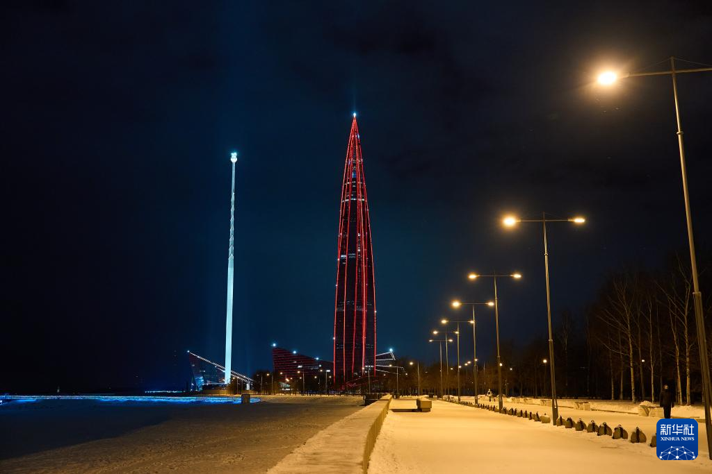2月15日,在俄罗斯圣彼得堡,拉赫塔中心点亮“中国红”。2月15日,俄罗斯最高建筑拉赫塔中心点亮“中国红”,庆祝马年春节。新华社发(郭飞洲摄)