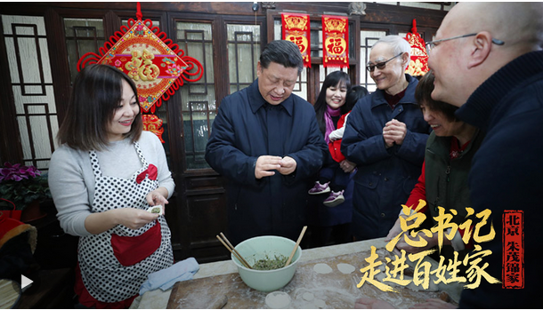 2019年春节前夕,习近平总书记走进北京市东城区草厂四条胡同。在居民朱茂锦家里,总书记与他们一家边包水饺边聊家常。总书记笑着说:“我家里也爱包茴香馅的。多年来因工作关系我没包过饺子了,你们看,越包越好。我们的生活也是这样,越过越好!”