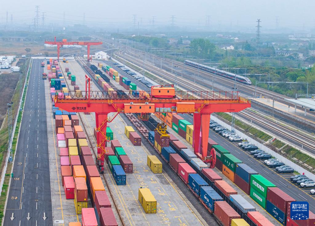 4月14日,在南京铁路物流中心江都物流基地内,大型起重设备将集装箱吊装到海铁联运列车,准备出口(无人机照片)。4月14日,海关总署发布数据显示,2026年一季度我国货物贸易进出口总值11.84万亿元,同比增长15%,季度规模首超11万亿元的同时,季度增速创近5年最高。新华社发(任飞摄)