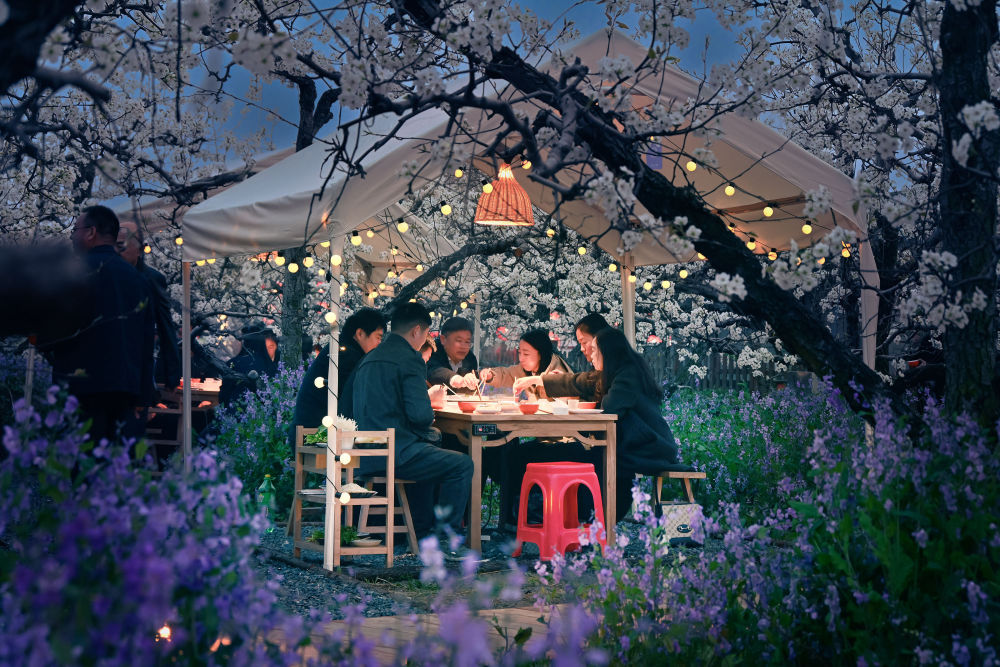 2026年3月30日,游客在安徽省宿州市砀山县梨小萌欢乐梨园品尝梨园火锅。新华社发(崔猛摄)